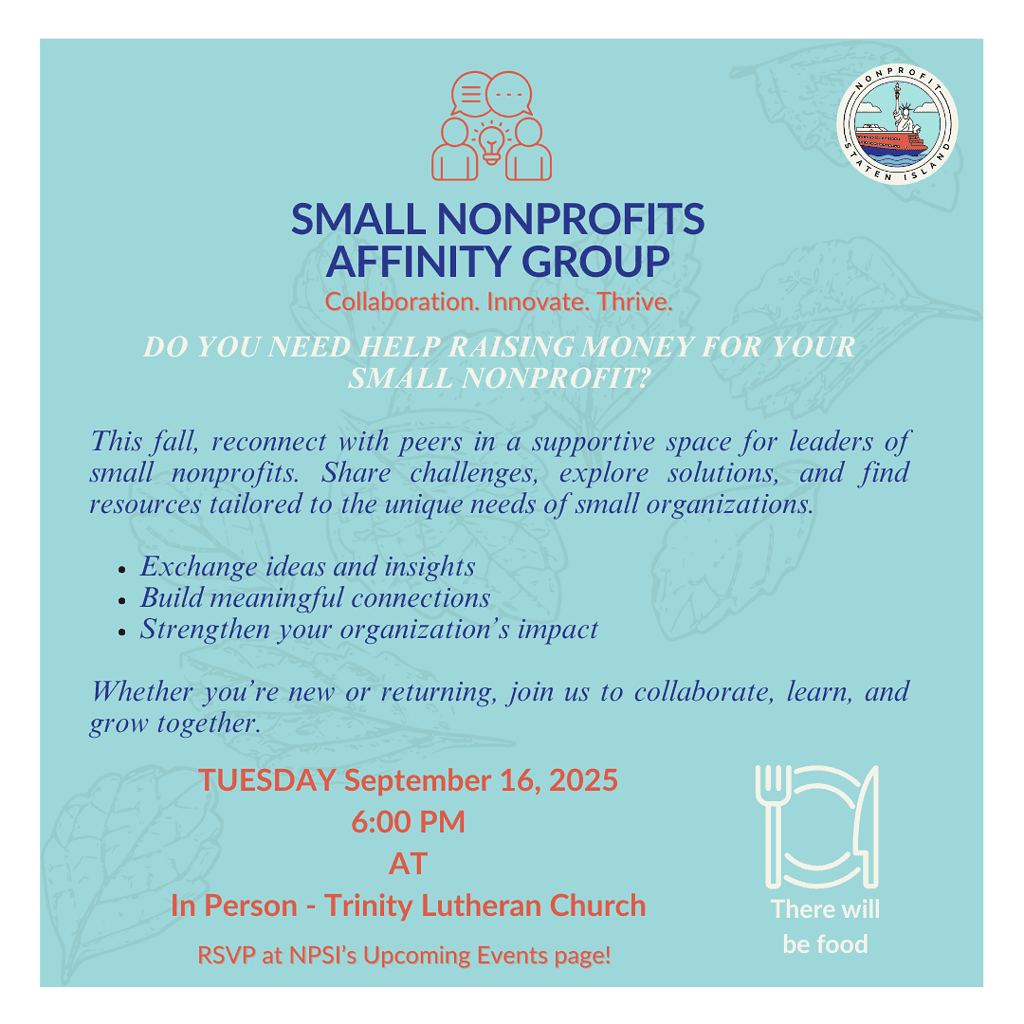 Nonprofit Staten Island’s Affinity Groups are safe, welcoming spaces where nonprofit professionals come together to share knowledge, exchange resources, and support one another. Whether you lead a grassroots organization or a large nonprofit, these peer forums help strengthen our sector by fostering collaboration and innovation.