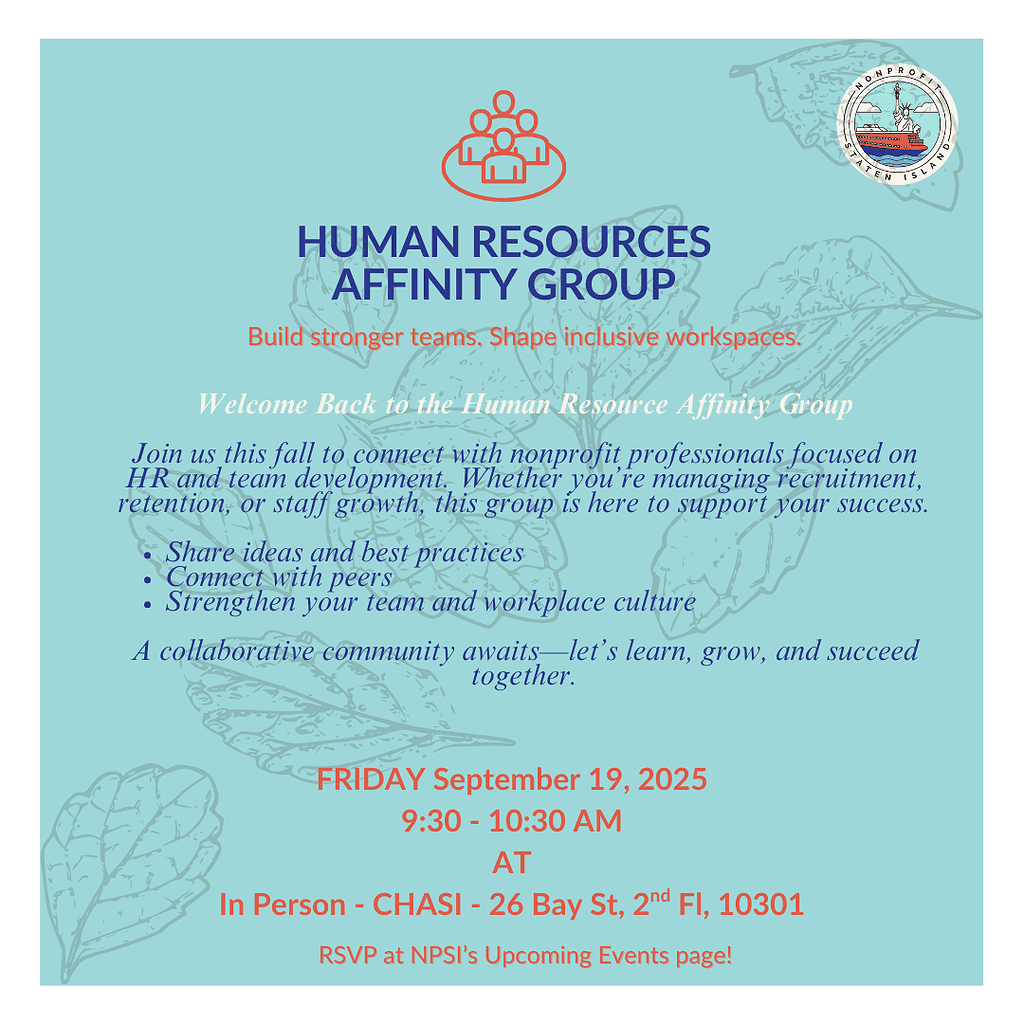 Looking to make a difference in your team or workplace? Nonprofit Staten Island’s Human Resources Affinity Group is a vibrant network of nonprofit HR professionals (and leaders fulfilling similar roles) working together to create stronger, more inclusive organizations and to support the people who lead and power them. Whether you’re new to HR or a seasoned pro, this group is your go-to space for sharing insights, overcoming challenges, and learning from peers to strengthen organizations and uplift the dedicated professionals of our sector.