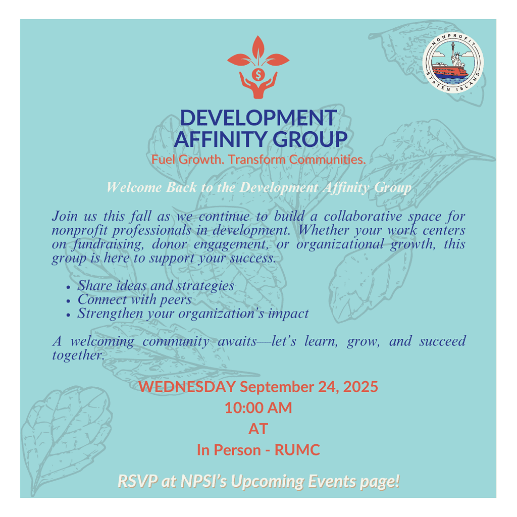 Fundraising and development are tough—whether you’re a small nonprofit figuring out how to secure your first major grant, a mid-sized organization looking for growth, or a large nonprofit focused on long-term sustainability. So, fundraisers, development pros, and nonprofit leaders—this group is for you! Nonprofit Staten Island’s Development Affinity Group connects passionate professionals dedicated to securing the resources that make a real impact in our local organizations and communities. Get insider tips on fundraising trends, donor engagement strategies, and fresh perspectives on ways to elevate your organization’s mission.