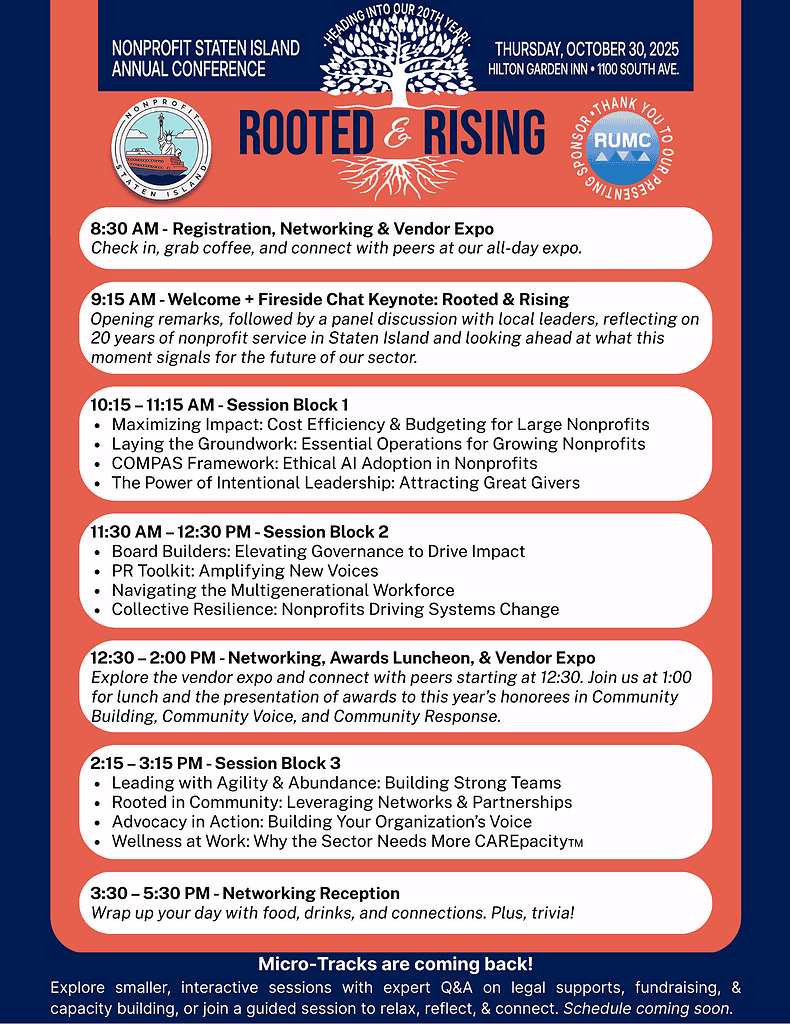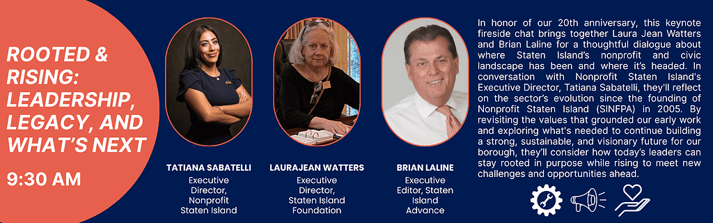 Nonprofit Staten Island’s annual conference is the only full-day event in Staten Island that is specifically focused on empowering and enhancing the capacity of the nonprofit sector. And this year, we’re marking a major milestone – 20 years of serving, supporting, and strengthening Staten Island’s nonprofit sector.