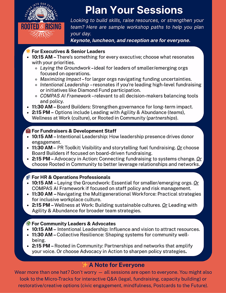 Join us as we reflect on how far we’ve come together, embrace and address new challenges, and fuel the future of our sector. With reimagined programming, powerful sessions, and a vibrant community of leaders, Rooted & Rising is about showing up for our missions, our teams, and our communities.